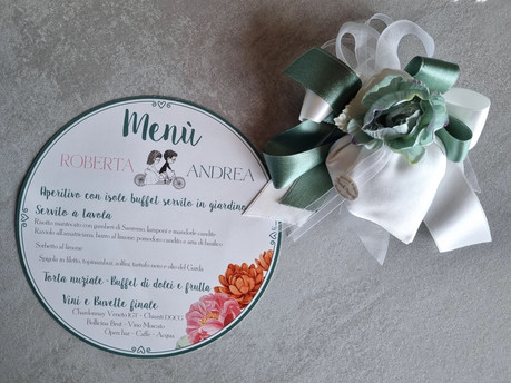 Per rappresentare la passione dei futuri sposi per le gite in bicicletta, invece, è stato scelto di creare un disegno che ritrae gli sposi su un tandem. Questa immagine simboleggia non solo il loro amore, ma anche il desiderio di condividere ogni avventura e ogni attimo della vita insieme. Per questo matrimonio a tema natura come colore principale è stato scelto il verde petrolio, un tono intenso e sofisticato che evoca la bellezza dei paesaggi montani e la freschezza dell’amore. Questo colore sarà il filo conduttore di tutto l’evento, creando un'armonia visiva che si snoderà dalle partecipazioni fino alla decorazione del ricevimento.